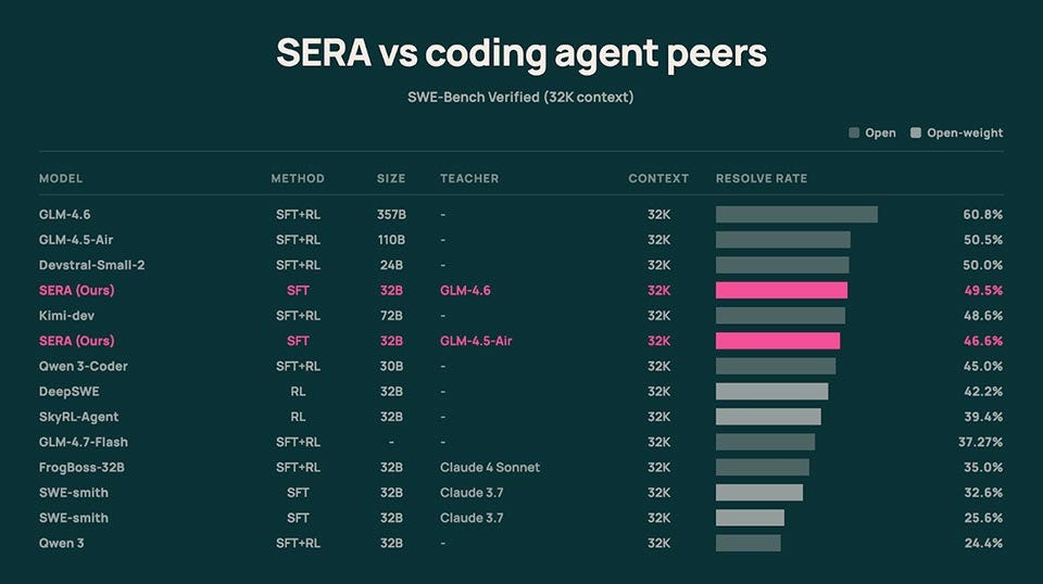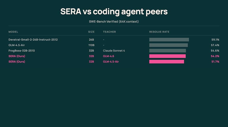 SERA also performs just as well as Devstral-Small-2 and GLM-4.5-Air on SWE-Bench Verified.