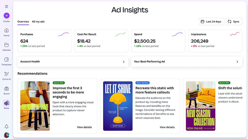 Canva is seeing companies use its platform to produce ads and marketing collateral. To help with brand, campaign, and performance management, the company is launching Canva Grow, its end-to-end marketing service. Teams can design and launch ads across platforms like Meta, track insights, and quickly refine content based on available performance metrics.