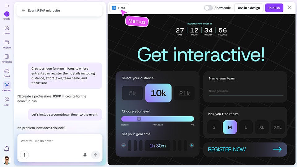 Finally, a few upgrades are coming to Canva’s Visual Suite, including a new video editor, a revamped email creation tool, new ways to collect data directly inside Canva, and Canva Sheets integration with Canva Code.