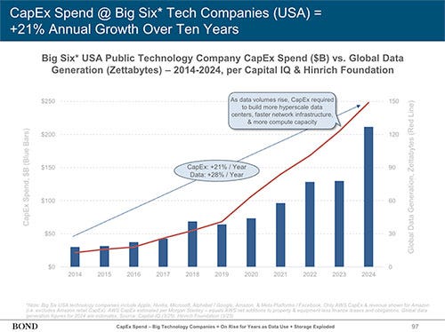 Artificial intelligence is forcing Big Tech firms (i.e., Apple, Nvidia, Microsoft, Alphabet, Amazon, and Meta) to invest heavily in capital expenditures. In the decade since 2014, spending among these companies has increased by more than 21 percent annually, driven by the dramatic rise in global data generation, a trend that has grown at a rate of more than 28 percent per year. And as these firms gobble up more data, they’ll need to put more dollars into building more hyperscale data centers, faster network infrastructure, and significantly more compute capacity to process and leverage this immense influx of data.