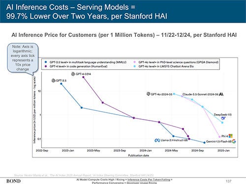 It’s becoming significantly cheaper to run inference in AI models. Meeker finds that the cost of making AI perform a task has plummeted by 99.7 percent over the past two years. When OpenAI’s GPT-3.5 debuted in late 2022, it had an inference price of more than $10 per million tokens. Its successor, GPT-4-0314 had a price tag of nearly $20 per million tokens. Fast forward to May 2024, and inference for GPT-4o-2024-05 would cost under $10 per million tokens. DeepSeek-V3, which launched at the end of 2024, costs under $1 per million tokens.