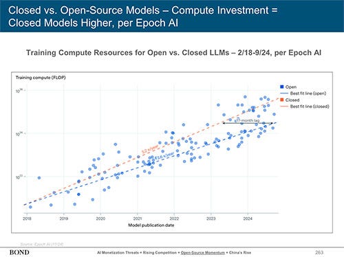 Which is better: Open-source AI or closed? That’s an ongoing debate in technology, but according to Meeker’s report, when it comes to where more computing resources are being devoted, closed models have the advantage. There’s a 17-month lag between closed and open models, meaning that the latter typically could achieve a similar level of compute intensity about 17 months after their closed-source counterparts. Moreover, closed models are said to have a steeper growth rate in compute (5.2x per year) compared to their open-source peers (3.6x per year).