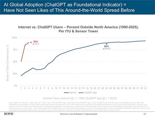 Meeker doesn’t hold back in calling AI’s rise “unprecedented”—a word she uses no fewer than 51 times throughout the report. But she’s not exaggerating. OpenAI’s ChatGPT, the poster child of this AI era, serves as her prime example of just how quickly the technology has been embraced. It’s the fastest app to top 100 million users in the past two decades. It only took five days for it to reach one million users, compared to the iPhone (74 days), and at a substantially lower price point ($0). Additionally, as for its global adoption, ChatGPT achieved 90 percent adoption in just three years. By comparison, the internet took 23 years to reach that feat and back then, it was considered to be one of the fastest technological rollouts in history.