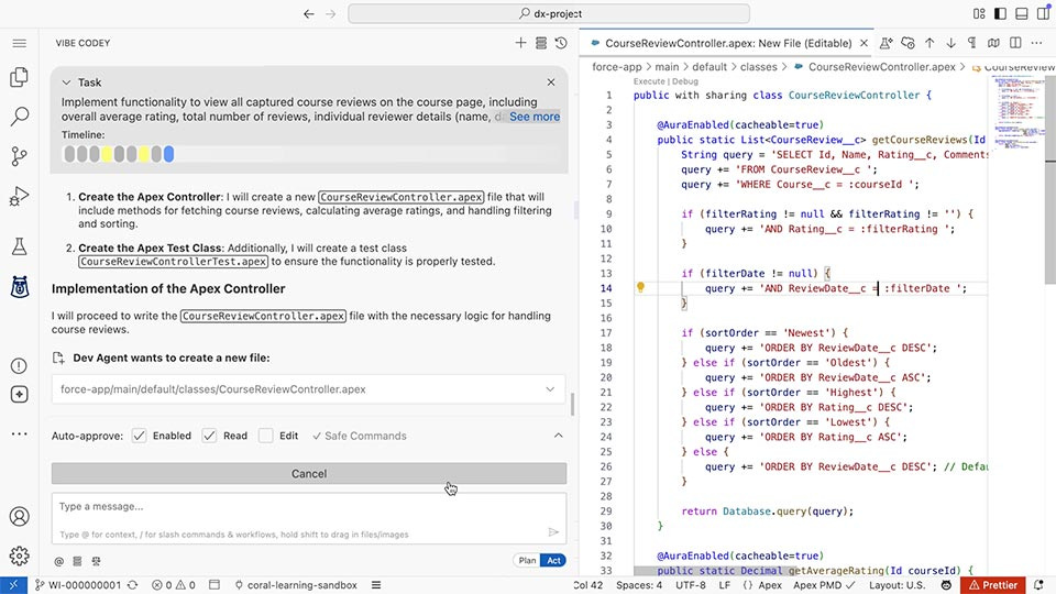 Salesforce describes Agentforce Vibes as an AI-powered integrated development environment (IDE), similar to Tabnine, Kite, Amazon CodeWhisperer, and GitHub Copilot. Naturally, it’s integrated with its sibling platforms, such as Salesforce Sandboxes, Code Analyzer, and DevOps Center. Agentforce Vibes can also be used in any Visual Studio Code-compatible IDE, including Anypoint Code Builder from MuleSoft (a Salesforce-owned company), Cursor, and Windsurf.